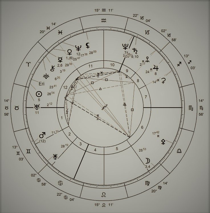 ASC: Bika: gyakorlatias, stabil megoldás a földdel kapcsolatban; Vénusz a Halakban a 12. Házban: köze van a ritmikussághoz, spiritualitáshoz (valláshoz), az emberek érdekében (hasznára) készült.
